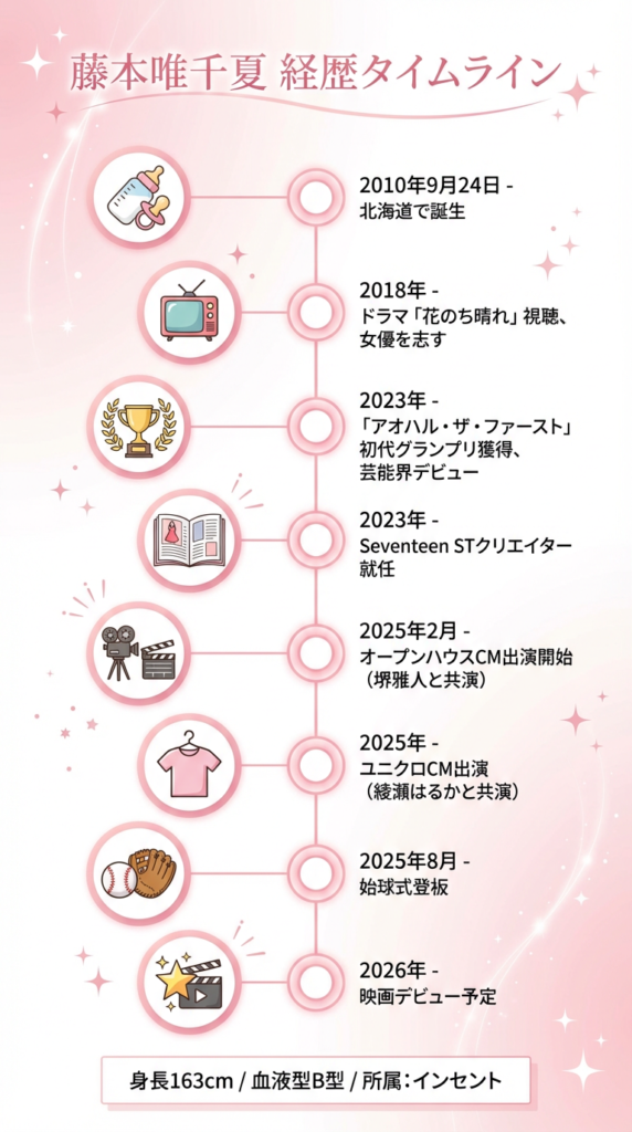 藤本唯千夏さんは、2010年9月24日生まれの現在15歳。北海道出身で、身長163cm、血液型はB型です。モデル・女優・タレントとして活動しており、山本美月さんや今田美桜さんなど人気女優を多数擁する芸能事務所「インセント」に所属しています。