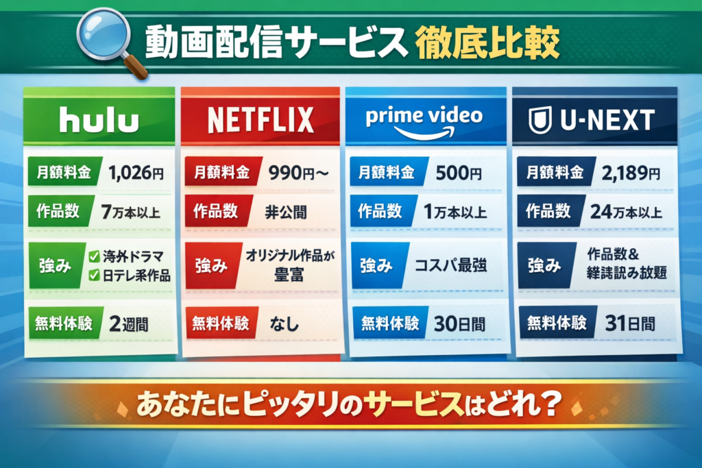 この記事では、Huluの特徴やメリット・デメリット、他サービスとの違いまでわかりやすく解説します。