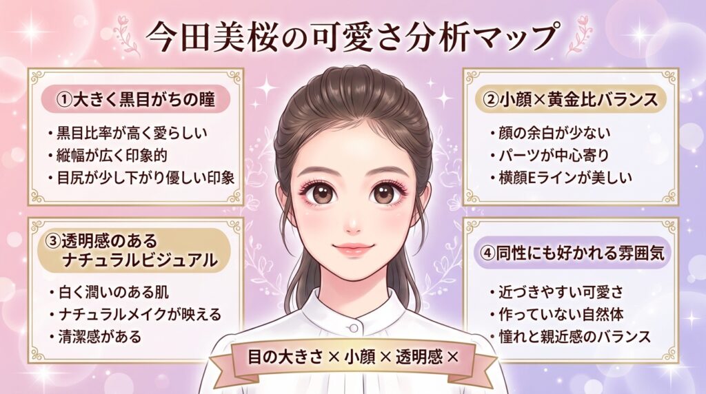 顔の余白が少ないため、写真でも映像でも“完成度が高く見える”。これが「どの角度から見ても可愛い」と言われる理由です。