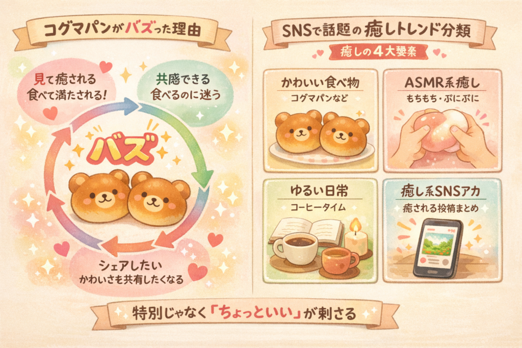そんな中、SNSを中心にじわじわと広がっているのが「癒しトレンド」です。中でも注目を集めているのが、韓国発の「コグマパン」や、かわいらしいスイーツ、ゆるい雰囲気の投稿など、“見ているだけでホッとするコンテンツ”。