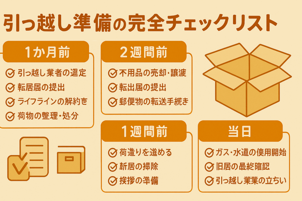 忘れがちな手続きや、引っ越し当日のチェックポイントもまとめたので、これ1枚で安心して準備を進められます。