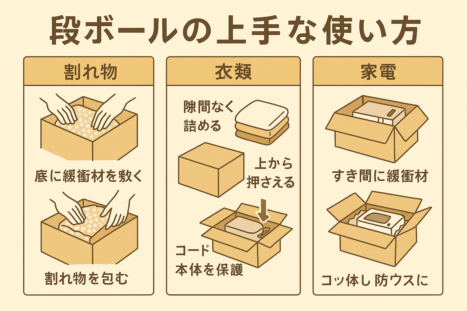 「どうやって詰めれば割れないの?」「衣類や家電はどんな箱に入れるの?」