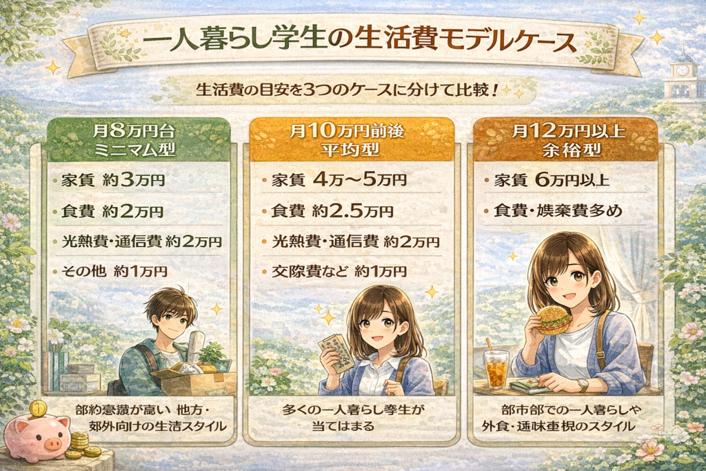 一人暮らし学生の生活費は、毎月およそ8万〜12万円前後が目安です。