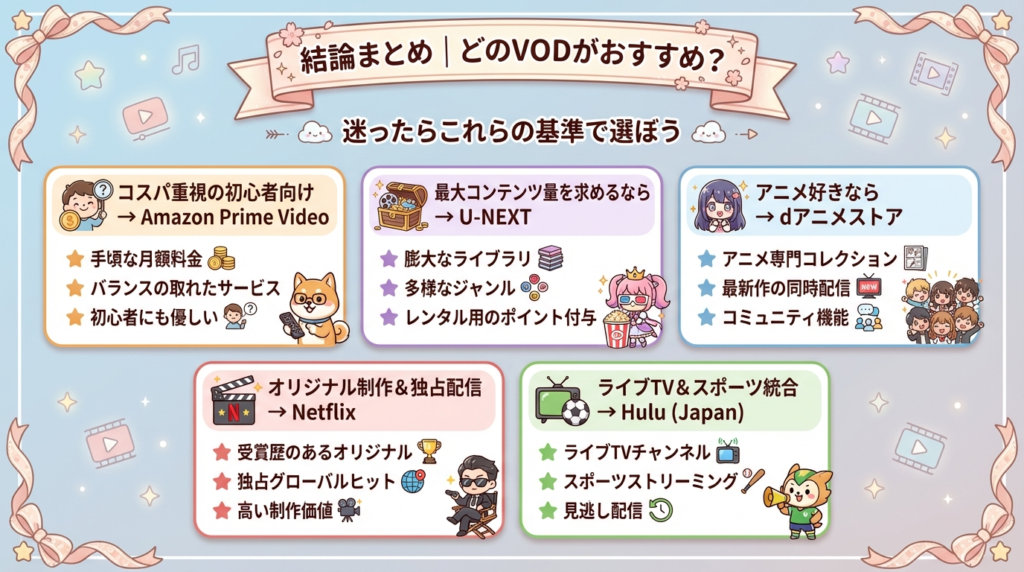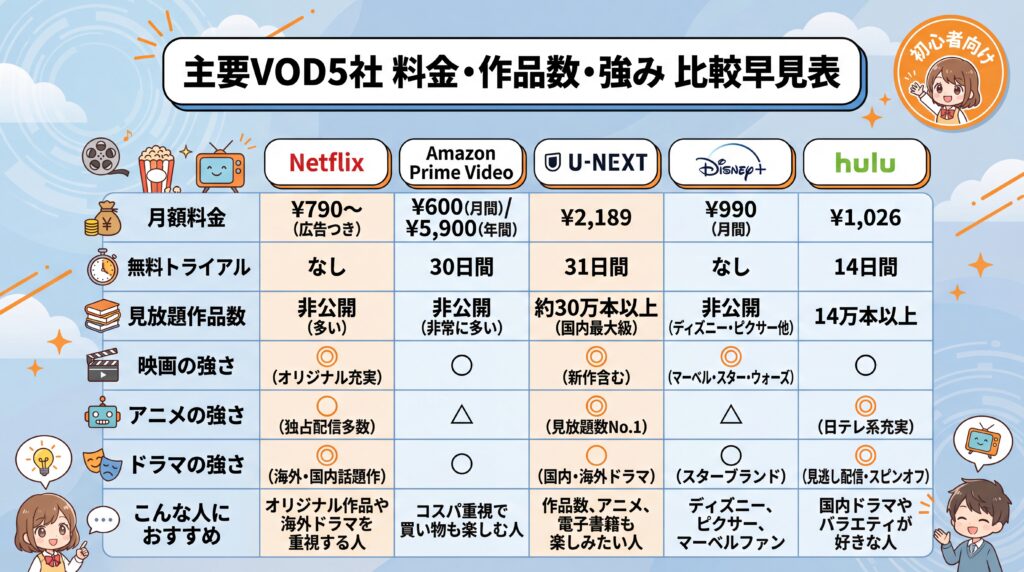 VOD初心者の方でも、この記事を読めば「自分に合う1社」が見つかるはずです。